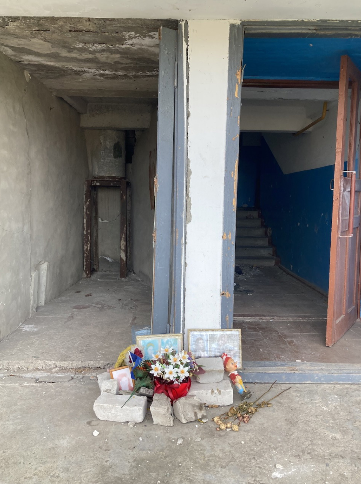 Kateryna Iakovlenko, Pershotravnev 2 en la ciudad de Izium, Óblast de Járkov, Ucrania. La entrada del edificio, 17- abril - 2025.