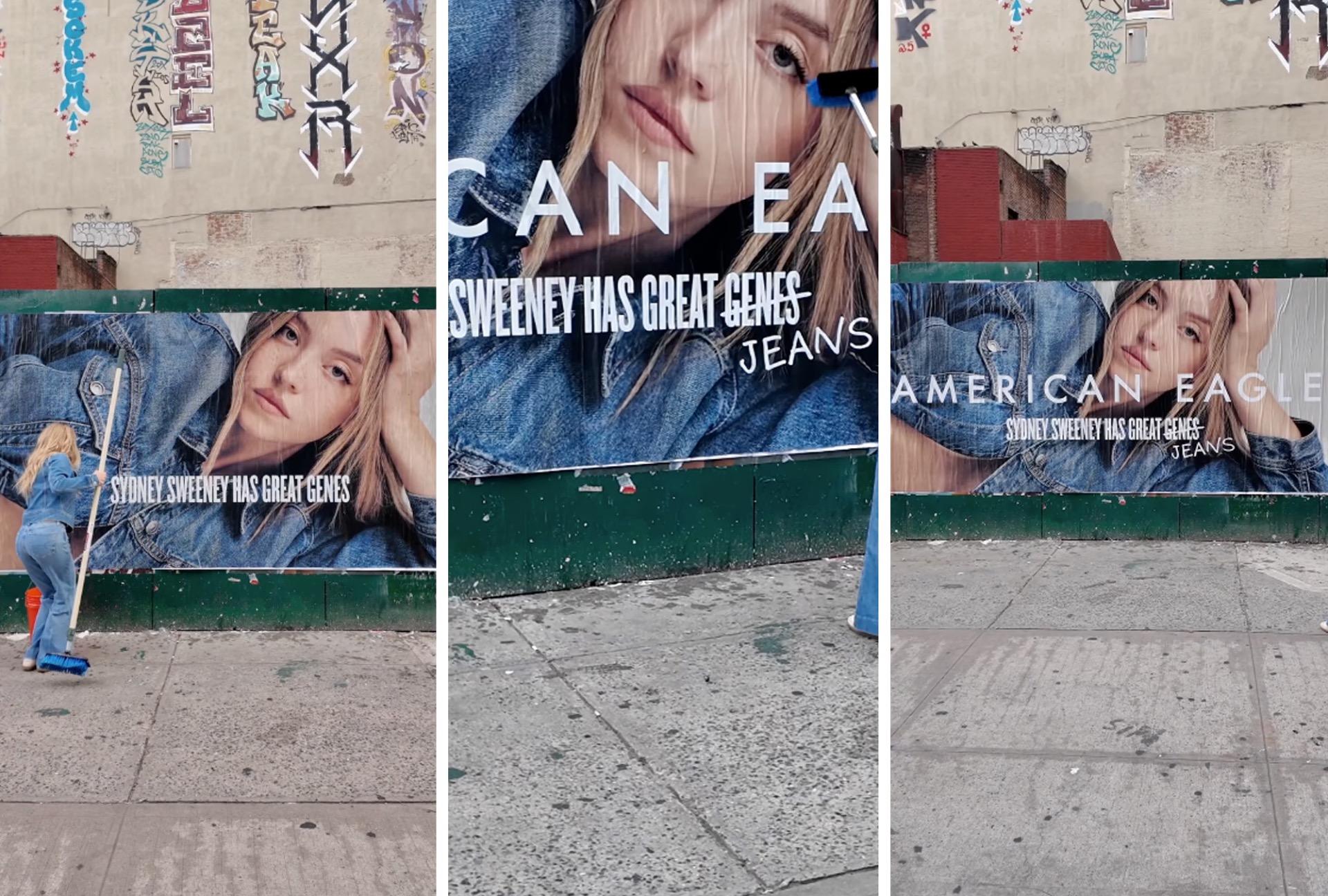 La actriz Sidney Sweeney es la protagonista de una publicidad gráfica en la que camina hacia un bilboard de la marca de jeans American Eagle. "Sydney Sweeney tiene grandes genes". En la publicidad la actriz tacha "genes" y sobrescribe con la palabra "jeans", que en la fonética inglesa suena parecido. La polémica publicidad muestra un intento de reivindicar los valores de la estética del siglo XX. Los comentarios y posteos no tardaron, y el punto máximo fue cuando recibe comentarios del presidente Trump: "¿Ella está registrada como republicana? Oh, ahora sí me encanta su anuncio" dijo a la prensa.