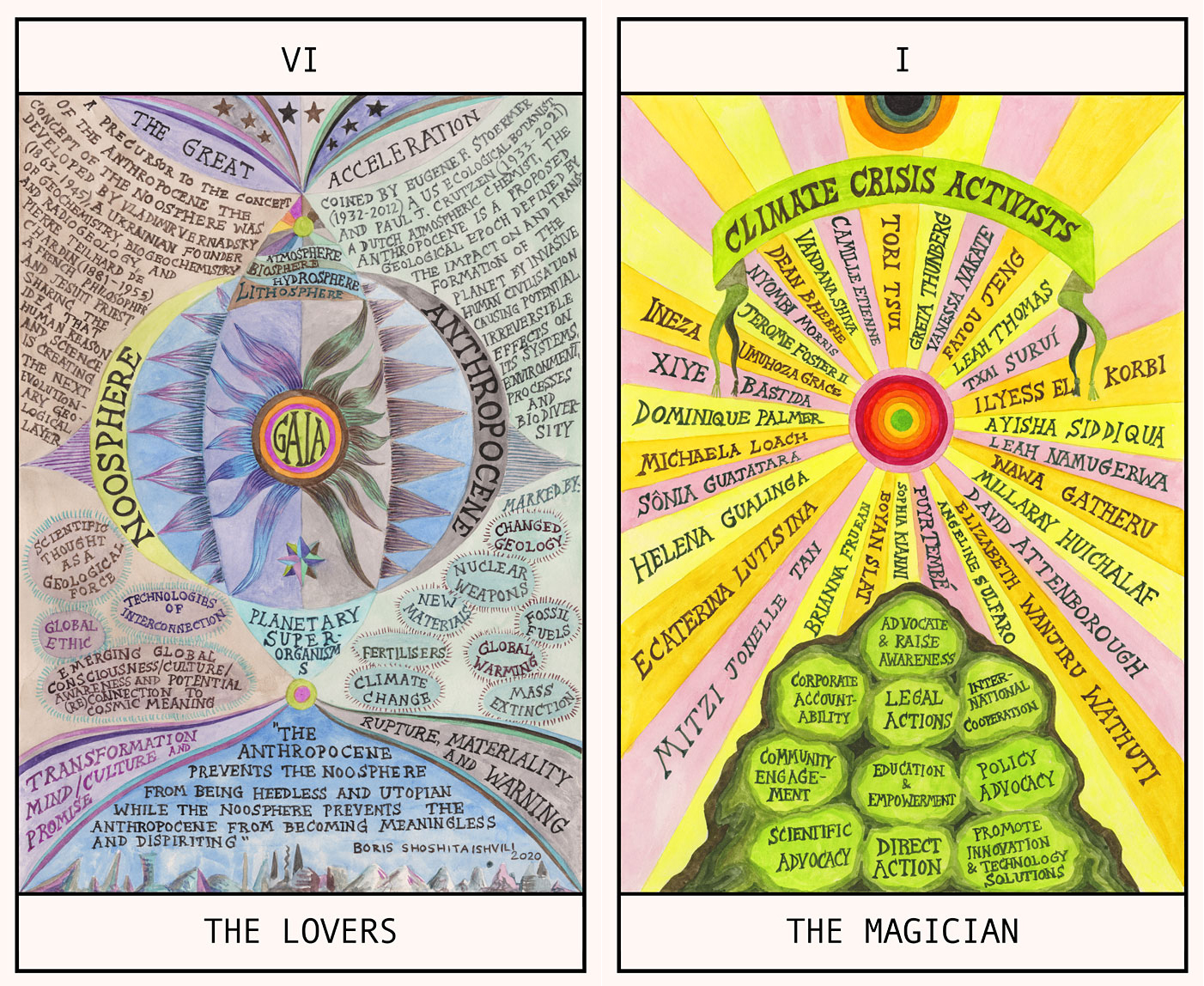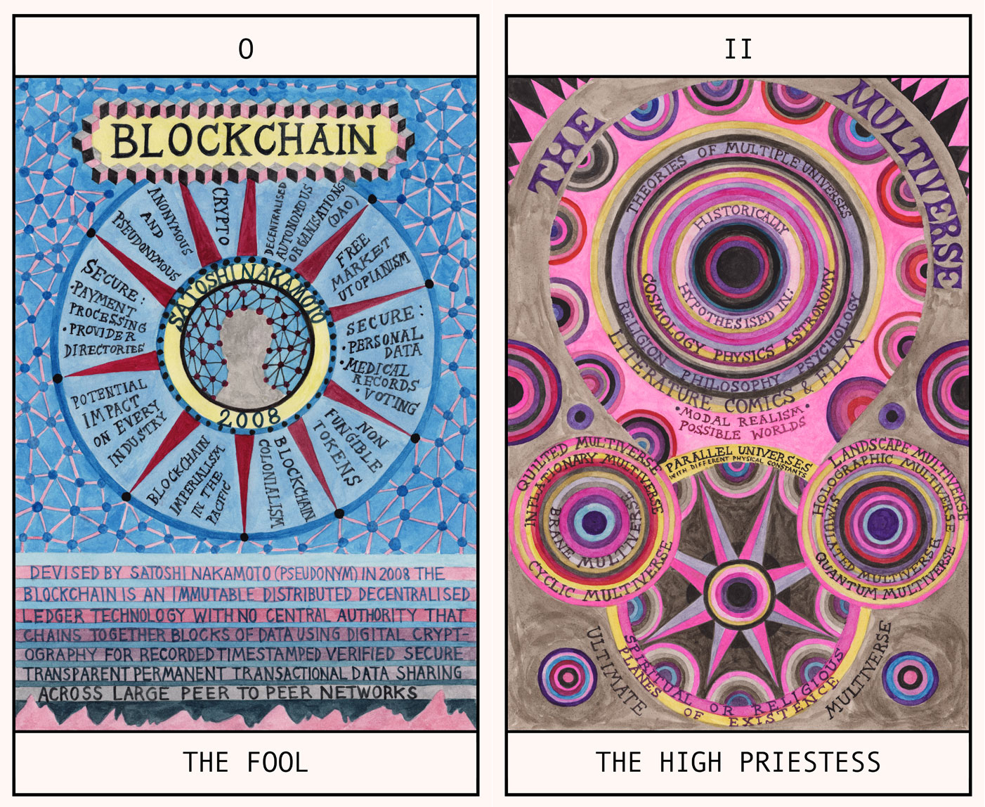 Los antiguos dibujos alquímicos recorren las cartas una por una. La artista plantea un enfoque holístico de las crisis sistémicas que amenazan el planeta y que no pueden ser abordadas adecuadamente por ninguna rama del conocimiento que excluya a todas las demás. Para Treister, todo sistema adivinatorio plantea una reflexión sobre los factores que dan forma al mundo actual y especula sobre la forma en que algunos medios adivinatorios podrían asegurarnos un futuro ético y sostenible.